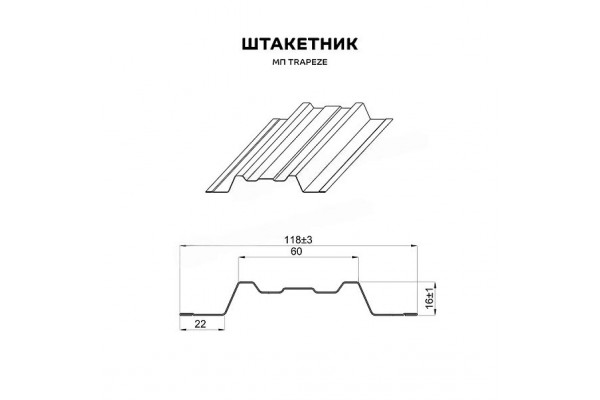 - Код товара: Штакетник металлический МП TRAPEZE-T 16,5х118 0.45мм о-образный
